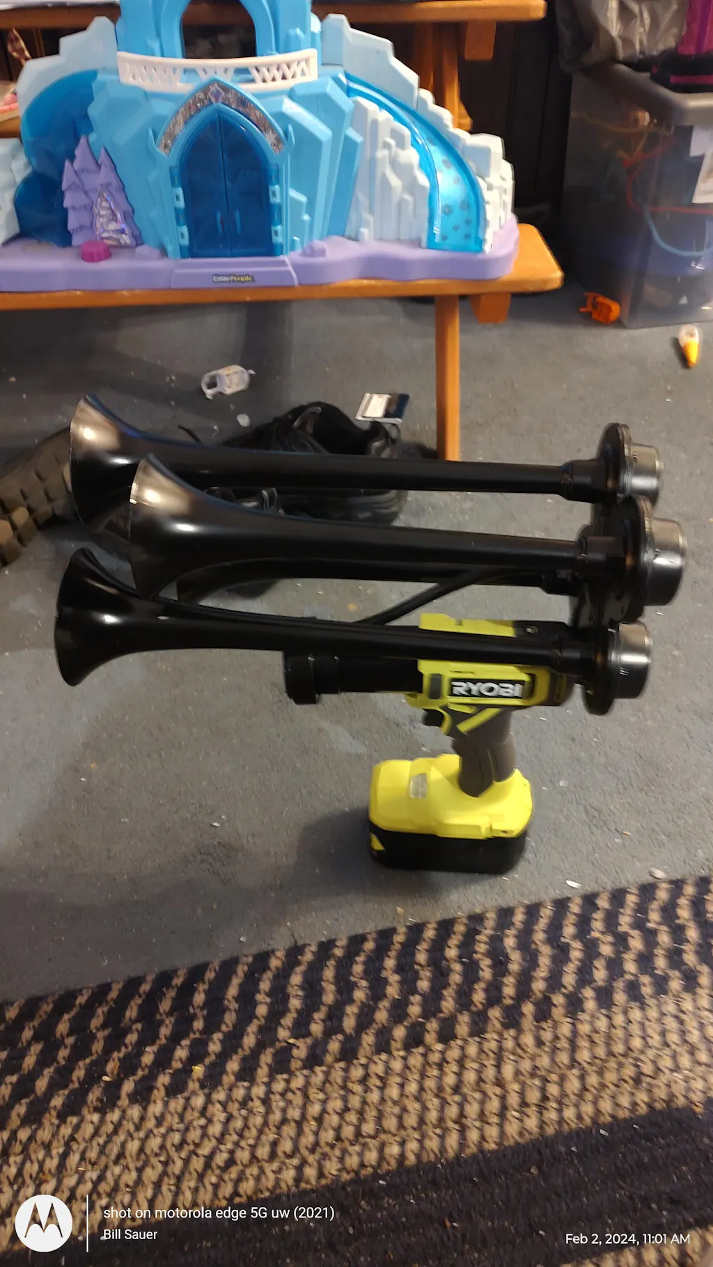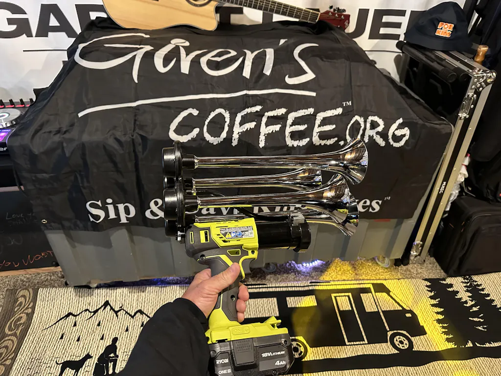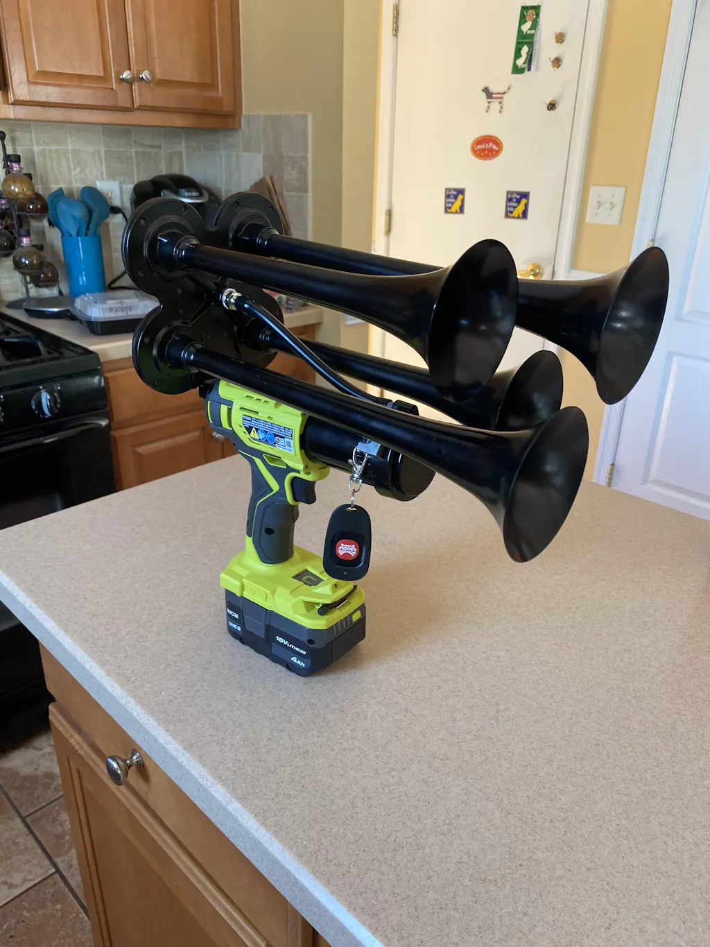 Conozca la bocina de tren Ryobi : una bocina compacta e inalámbrica construida a partir de un Taladro/destornillador de impacto Ryobi original, nuevo y acabado con trompetas de metal duraderas. Está diseñado específicamente para señalización, momentos de entusiasmo y alertas de emergencia sin dejar de ser liviano. Portátil y fácil de usar.
