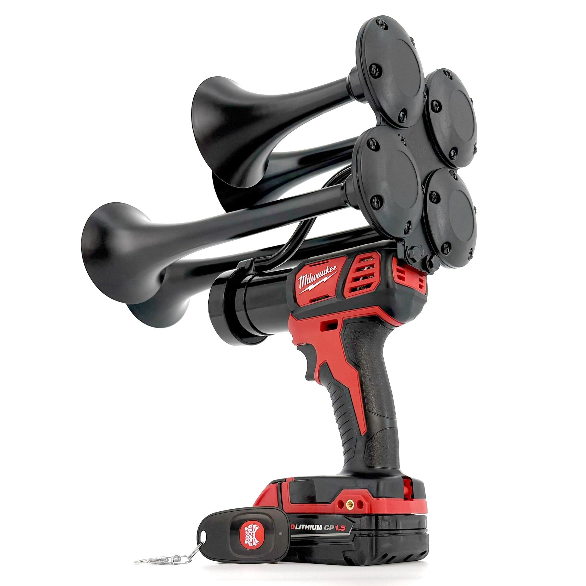 The Milwaukee Quad Train Horn delivers powerful 130dB sound, making it the perfect middle-ground option for those who want serious volume without going extreme. Built from a brand-new Milwaukee impact driver, this horn features four durable metal trumpets, ensuring a deep, commanding tone. With a 160ft remote control range, you can activate it from a distance with ease. Designed for convenience, it runs on any Milwaukee M18 battery, offering long-lasting performance on a single charge.